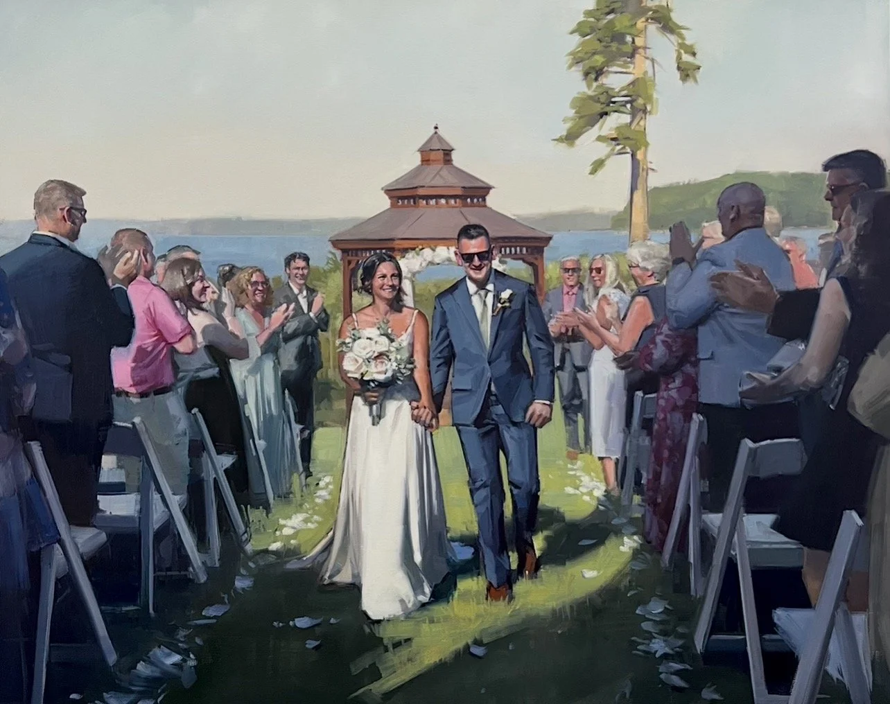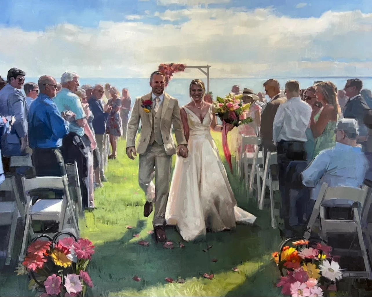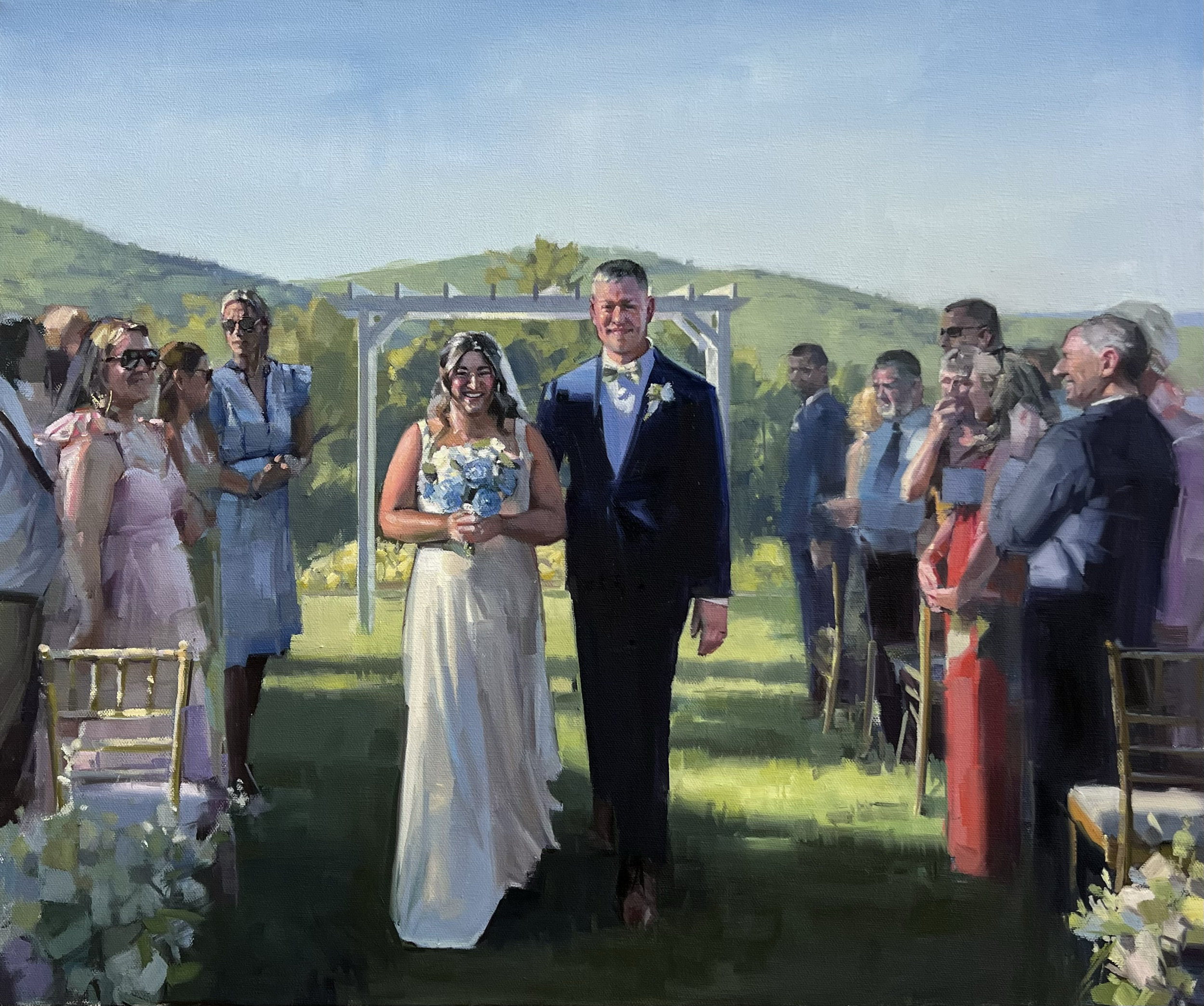 This might be the most popular choice for my work. It’s perfect for capturing the raw emotion of that just married moment. You can choose to have excitement of the guests incorporated or leave it out to create a more intimate painting.